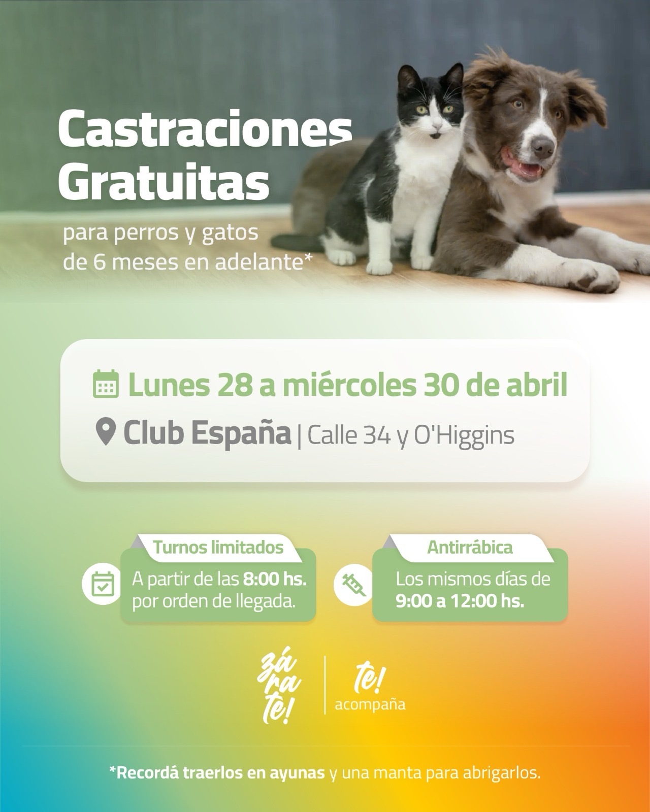 Los operativos de castración se realizarán del lunes 28 al miércoles 30 de abril en el Club España ubicado en Calle 34 y O’Higgins del barrio Los Robles (pasando barrio España hacia el Parque Industrial).