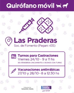 La Dirección General de Calidad Ambiental, Bromatología y Zoonosis del Municipio informa que la semana próxima el quirófano móvil visitará el barrio Las Praderas.