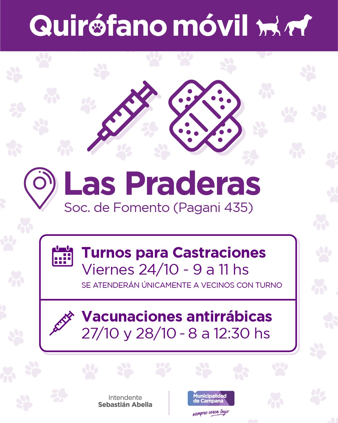 La Dirección General de Calidad Ambiental, Bromatología y Zoonosis del Municipio informa que la semana próxima el quirófano móvil visitará el barrio Las Praderas.