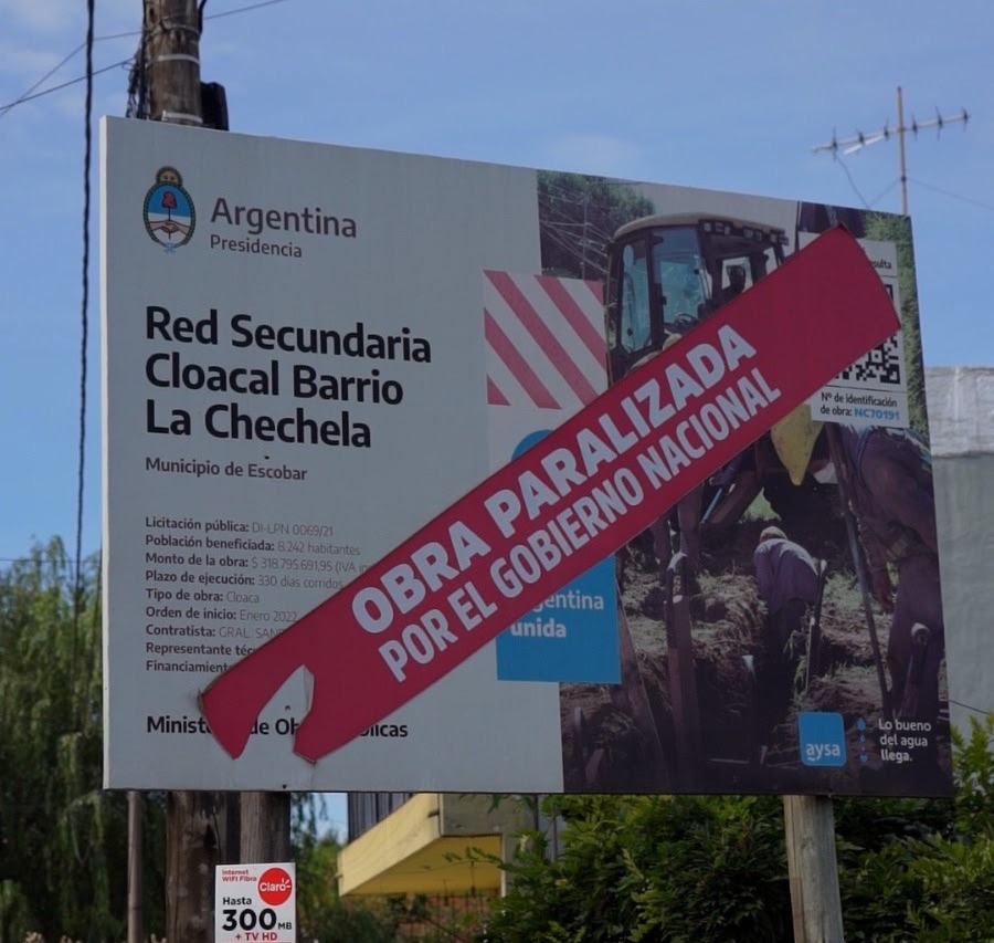 En el partido de Escobar, la falta de inversión nacional se traduce en la paralización de las obras de AySA, vinculadas a desagües cloacales y agua corriente, en las que ni siquiera se consideró su grado de avance, además de obras clave como el entubamiento del arroyo Bedoya, el Hospital del Bicentenario, la obra del Curvón de Garín para reordenar el tránsito, y otras intervenciones para mejorar la infraestructura urbana, las escuelas y los servicios esenciales.