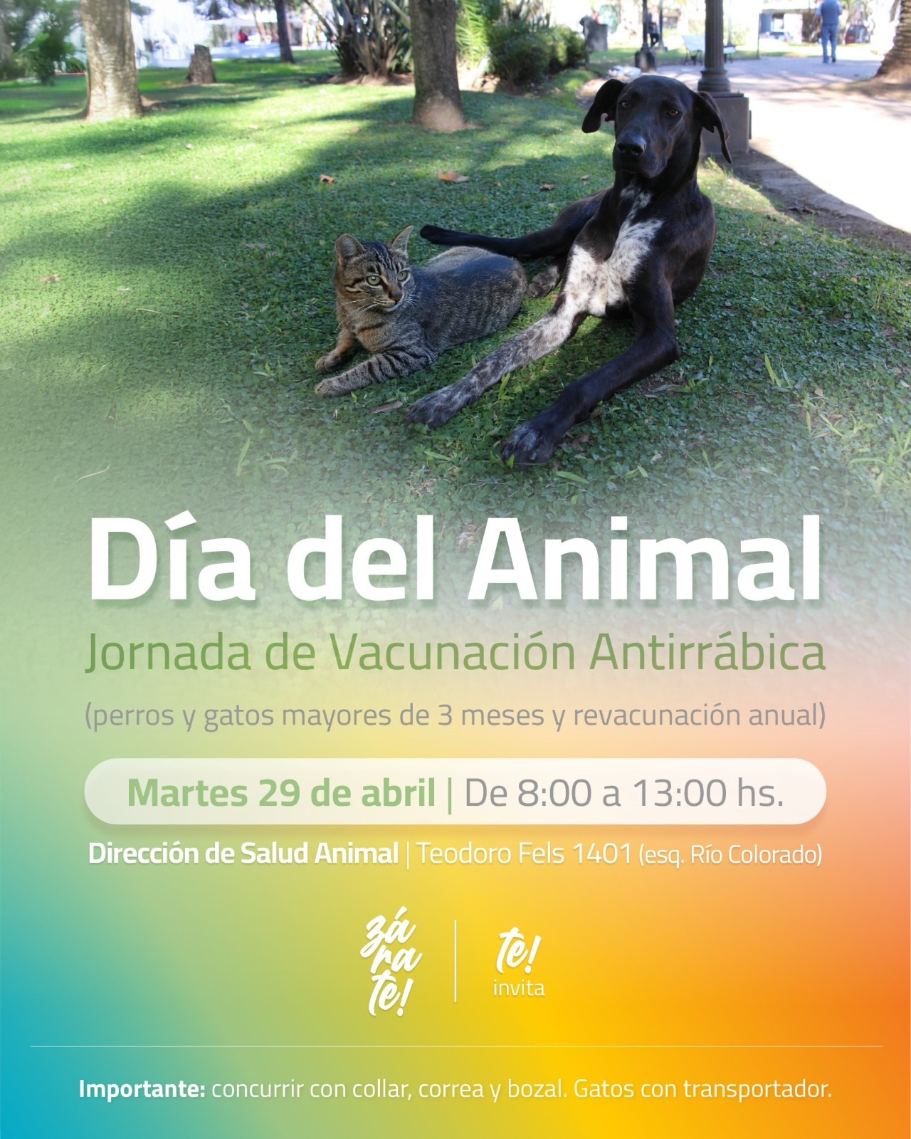 Este martes 29 de abril de 8 a 13 hs tendrá lugar en Teodoro Fels 1401 (Dirección de Salud Animal) una jornada de vacunación antirrábica para caninos y felinos mayores a 3 meses y para aquellos que deban recibir revacunación anual.