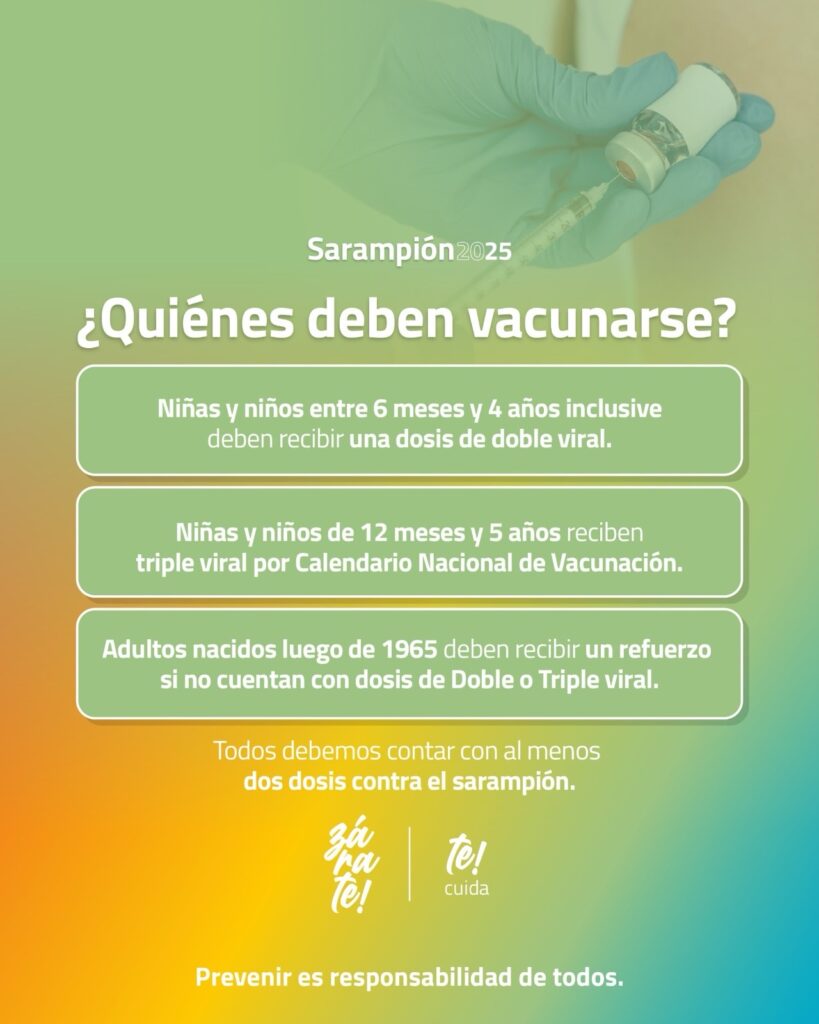 Además, el esquema de vacunación indicado por el Calendario Nacional contempla una primera dosis de vacuna triple viral (sarampión – rubéola – paperas) a los 12 meses y un refuerzo a los 5 años (ingreso escolar).